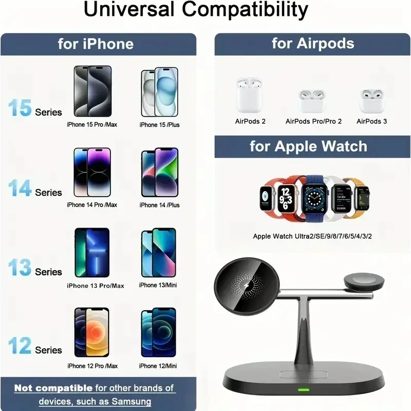 La station de charge sans fil peut charger votre pour apple iwatch 2/3/4/5/6/SE/7【PAS pour Samsung Watch】, Airpods Pro/2/3, téléphones en même temps, comme pour iPhone 13/13 Pro/13 Pro Max/13 Mini/12/12 Pro/12 Pro Max/12 Mini